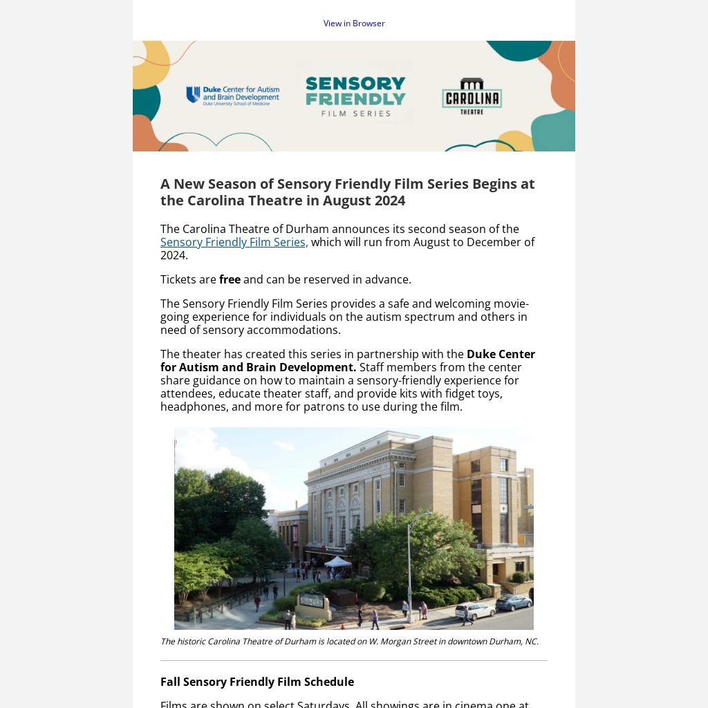 The Carolina Theatre collaborates with an advisory committee comprised of individuals from Arts Access NC, Autism Society of North Carolina, Autismazing, and other organizations. The committee helps the theater select a wide range of films to appeal to children, teens, and adults.