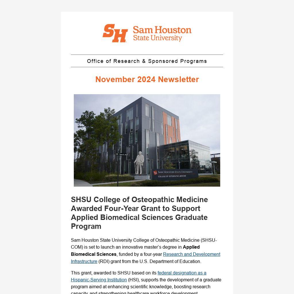 SHSU College of Osteopathic Medicine Awarded Four-Year Grant to Support Applied Biomedical Sciences Graduate Program |
