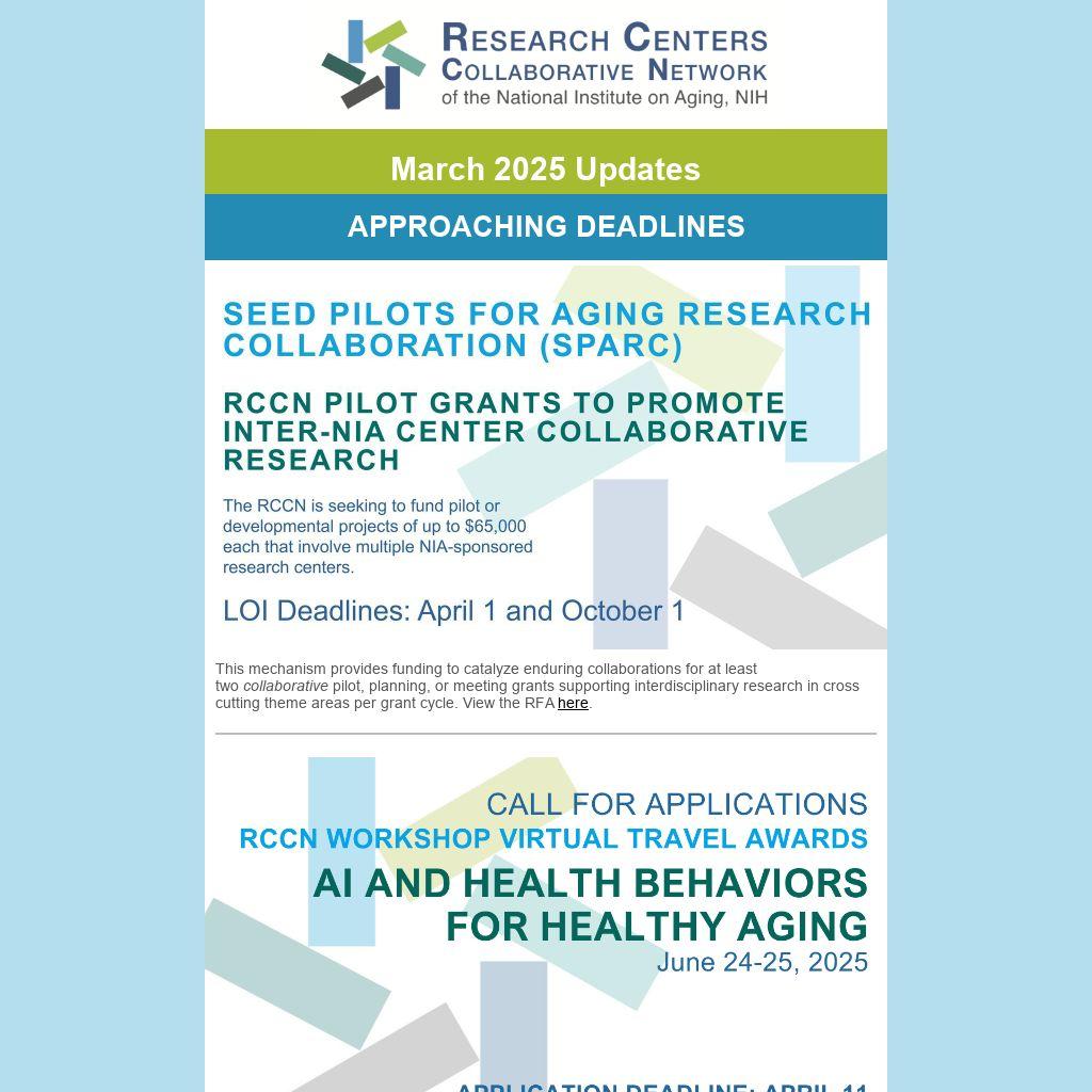 Follow us for updates on RCCN activities. In addition, for the starter pack of the RCCN centers and coordinating centers on Bluesky, click here. Please reach out to us at contact@rccn-aging.org if you have an NIA-funded center account we should add to our starter pack.