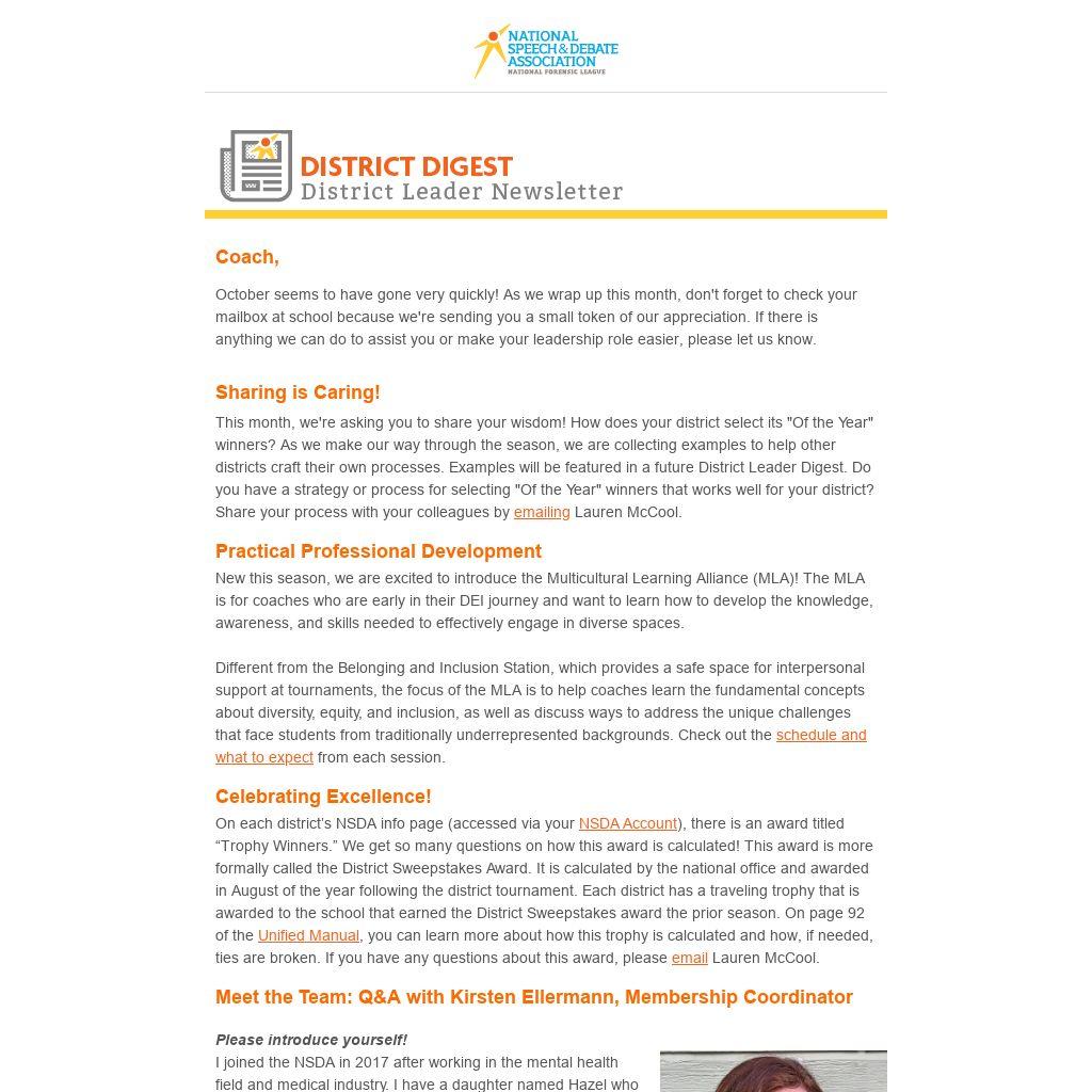 This month, we're asking you to share your wisdom! How does your district select its "Of the Year" winners? As we make our way through the season, we are collecting examples to help other districts craft their own processes. Examples will be featured in a future District Leader Digest. Do you have a strategy or process for selecting "Of the Year" winners that works well for your district? Share your process with your colleagues by emailing Lauren McCool.