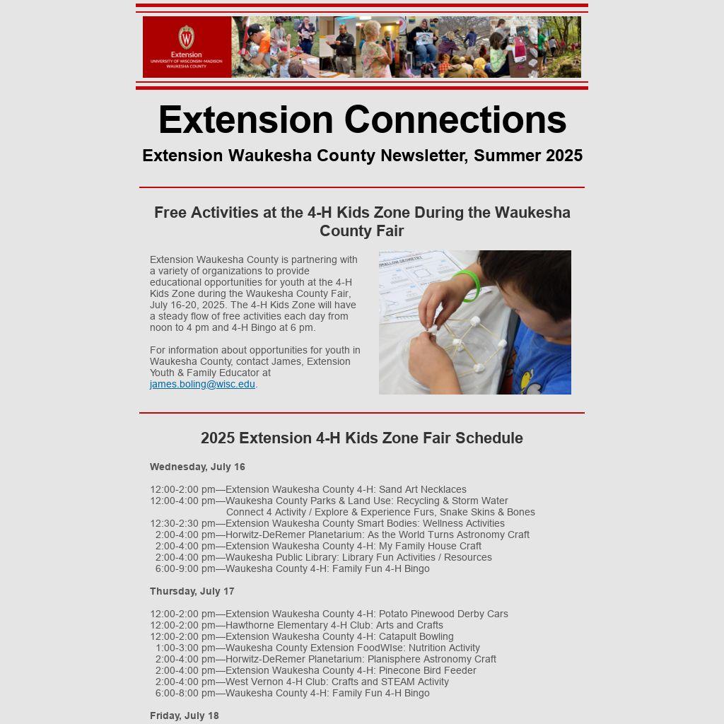 Extension Waukesha County is partnering with a variety of organizations to provide educational opportunities for youth at the 4-H Kids Zone during the Waukesha County Fair, July 16-20, 2025. The 4-H Kids Zone will have a steady flow of free activities each day from noon to 4 pm and 4-H Bingo at 6 pm.