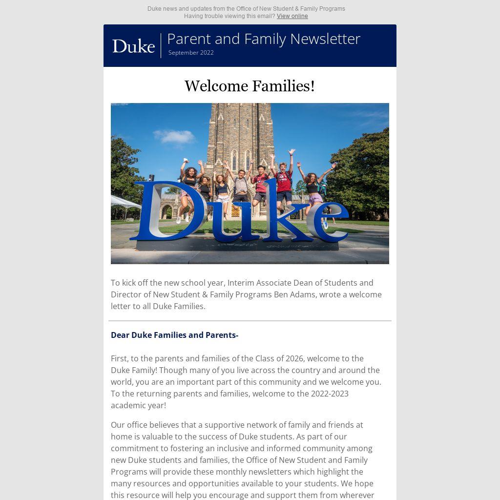 First, to the parents and families of the Class of 2026, welcome to the Duke Family! Though many of you live across the country and around the world, you are an important part of this community and we welcome you. To the returning parents and families, welcome to the 2022-2023 academic year!