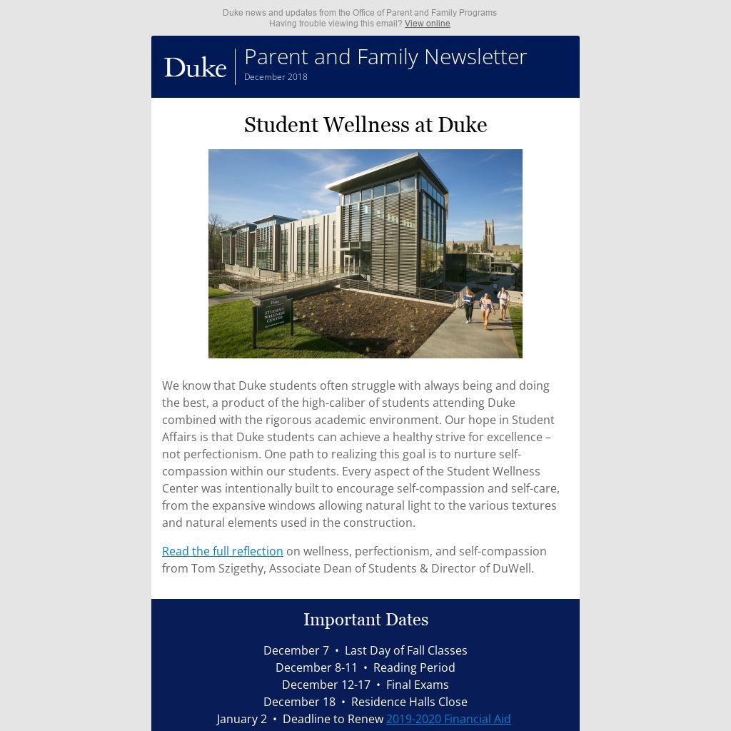 We know that Duke students often struggle with always being and doing the best, a product of the high-caliber of students attending Duke combined with the rigorous academic environment. Our hope in Student Affairs is that Duke students can achieve a healthy strive for excellence – not perfectionism. One path to realizing this goal is to nurture self-compassion within our students. Every aspect of the Student Wellness Center was intentionally built to encourage self-compassion and self-care, from the expansive windows allowing natural light to the various textures and natural elements used in the construction. Read the full reflection on wellness, perfectionism, and self-compassion from Tom Szigethy, Associate Dean of Students & Director of DuWell.