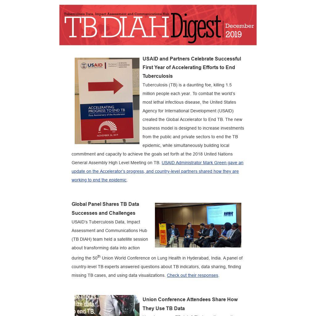 USAID’s Tuberculosis Data, Impact Assessment and Communications Hub (TB DIAH) team held a satellite session about transforming data into action during the 50th Union World Conference on Lung Health in Hyderabad, India. A panel of country-level TB experts answered questions about TB indicators, data sharing, finding missing TB cases, and using data visualizations. Check out their responses.