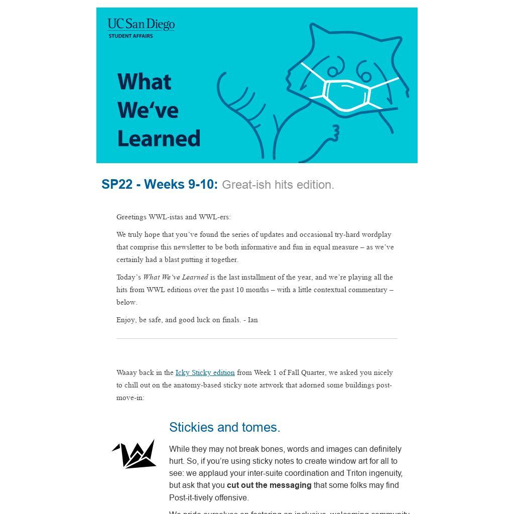 Thank you, Tritons, for continuing to mask up during events and outdoor activities. Because of your diligence and hard work, COVID cases continue to drop… and as sure as the setting sun: future decisions to ease restrictions on campus are dictated by data.