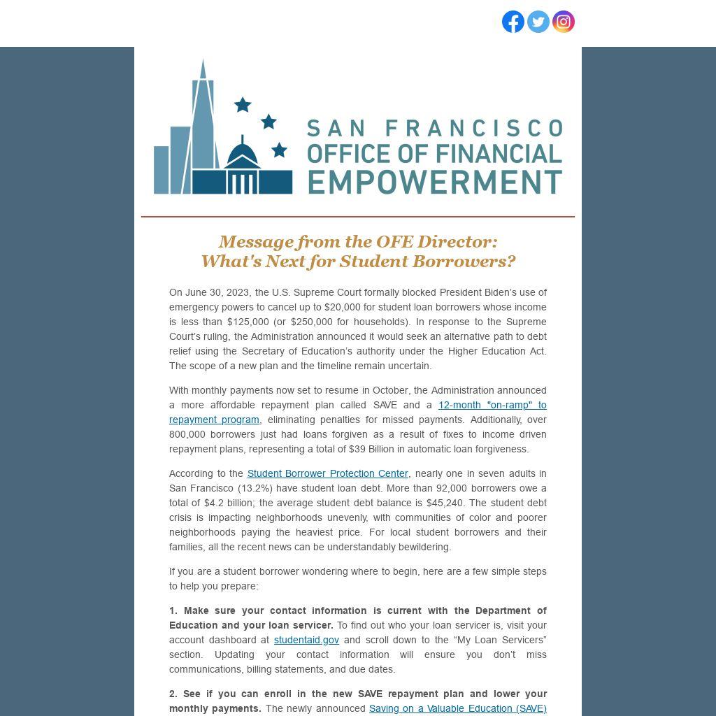 4. Get help! Studentaid.gov and the CA Department of Financial Protection and Innovation are trusted sources of up-to-date information or tackle your unique situation with the help of a financial coach, make a free appointment with OFE’s Smart Money Coaching program. Finally, beware of student loan related scams-enrolling in all Federal student loan relief programs is free and available through self-service or your loan servicer. Learn more about scams and file complaints with DFPI.