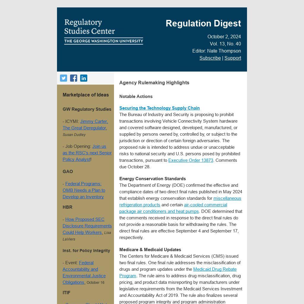 Notable ActionsSecuring the Technology Supply Chain The Bureau of Industry and Security is proposing to prohibit transactions involving Vehicle Connectivity System hardware and covered software designed, developed, manufactured, or supplied by persons owned by, controlled by, or subject to the jurisdiction or direction of certain foreign adversaries. The proposed rule is intended to address undue or unacceptable risks to national security and U.S. persons posed by prohibited transactions, pursuant to Executive Order 13873. Comments due October 28.