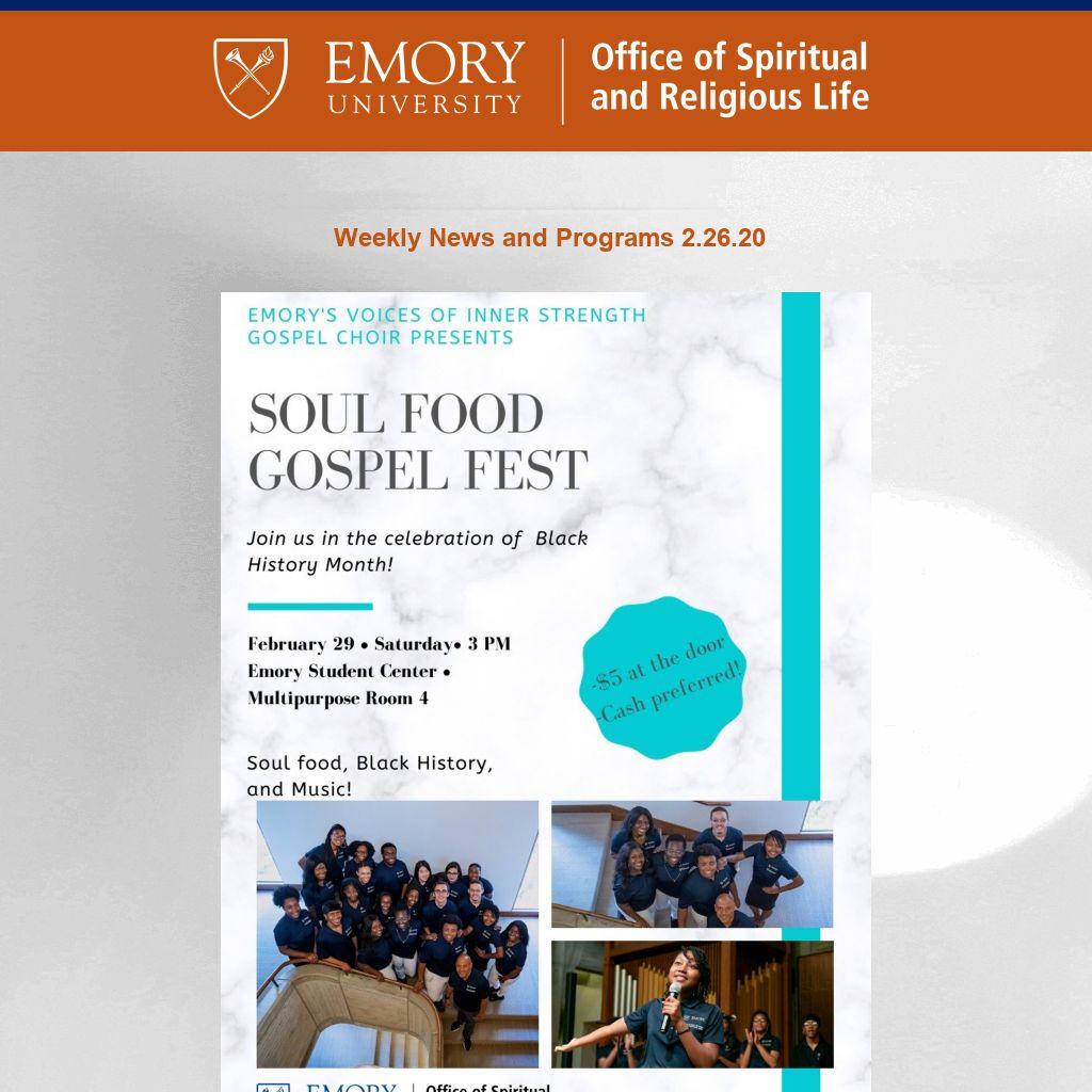 Emory OSRL Enews is published weekly during term by the Emory University Office of Spiritual and Religious Life covering Atlanta-campus programs. For Oxford College spiritual life, please click here. To submit information or to update your preferences, please contact religiouslife@emory.edu.