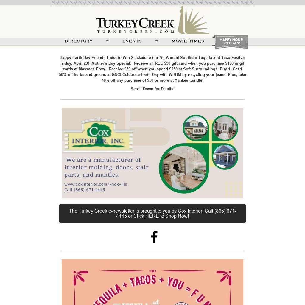 Happy Earth Day Friend! Enter to Win 2 tickets to the 7th Annual Southern Tequila and Taco Festival Friday, April 29! Mother's Day Special: Receive a FREE $50 gift card when you purchase $150 in gift cards at Massage Envy. Receive $50 off when you spend $250 at Soft Surroundings. Buy 1, Get 1 50% off herbs and greens at GNC! Celebrate Earth Day with WHBM by recycling your jeans! Plus, take 40% off any purchase of $50 or more at Yankee Candle.