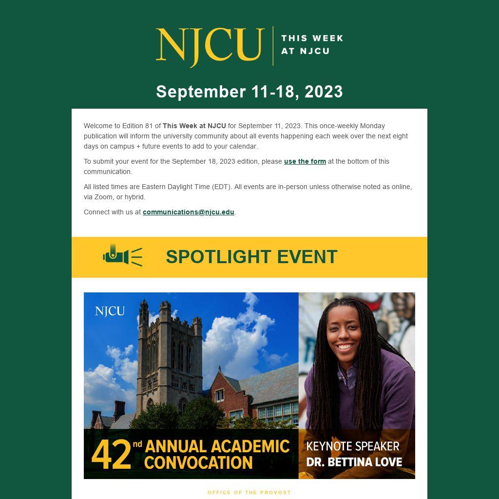 Welcome to Edition 81 of This Week at NJCU for September 11, 2023. This once-weekly Monday publication will inform the university community about all events happening each week over the next eight days on campus + future events to add to your calendar.