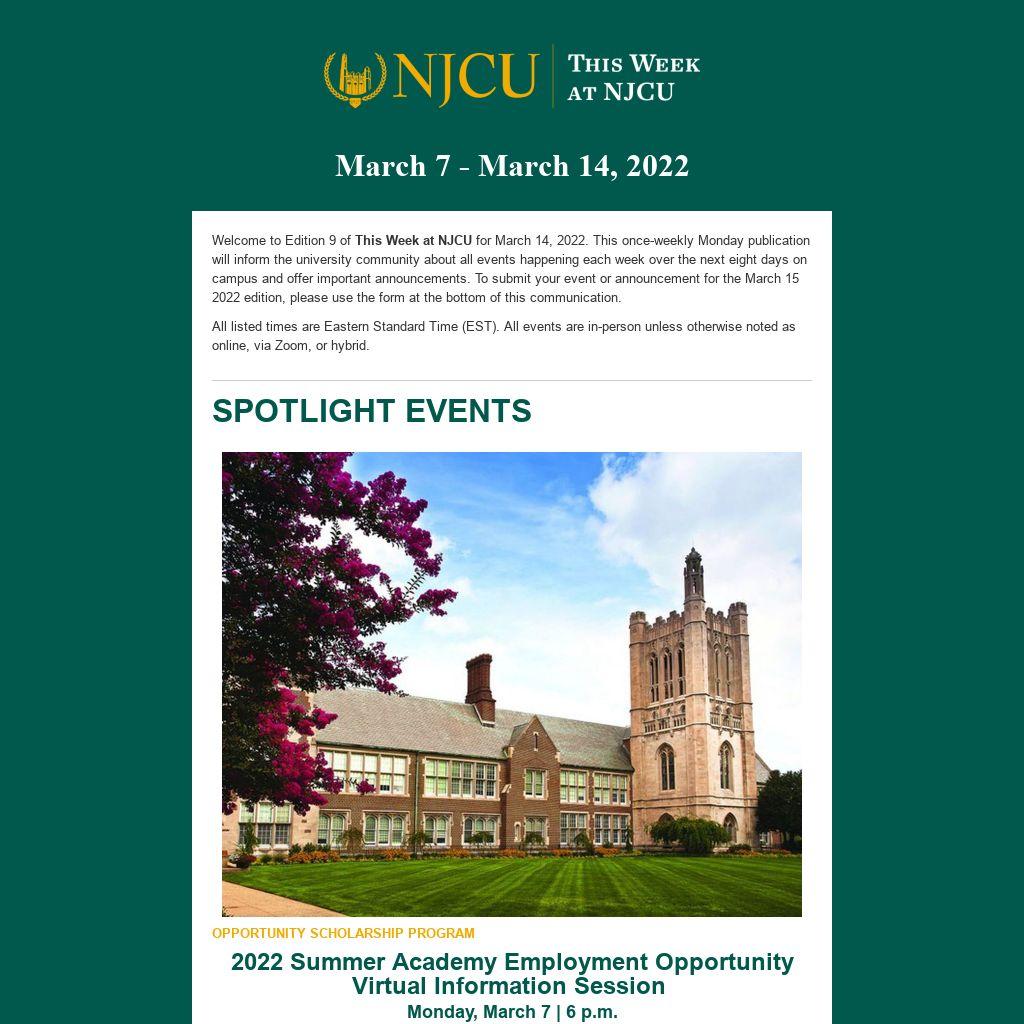 Welcome to Edition 9 of This Week at NJCU for March 14, 2022. This once-weekly Monday publication will inform the university community about all events happening each week over the next eight days on campus and offer important announcements. To submit your event or announcement for the March 15 2022 edition, please use the form at the bottom of this communication.