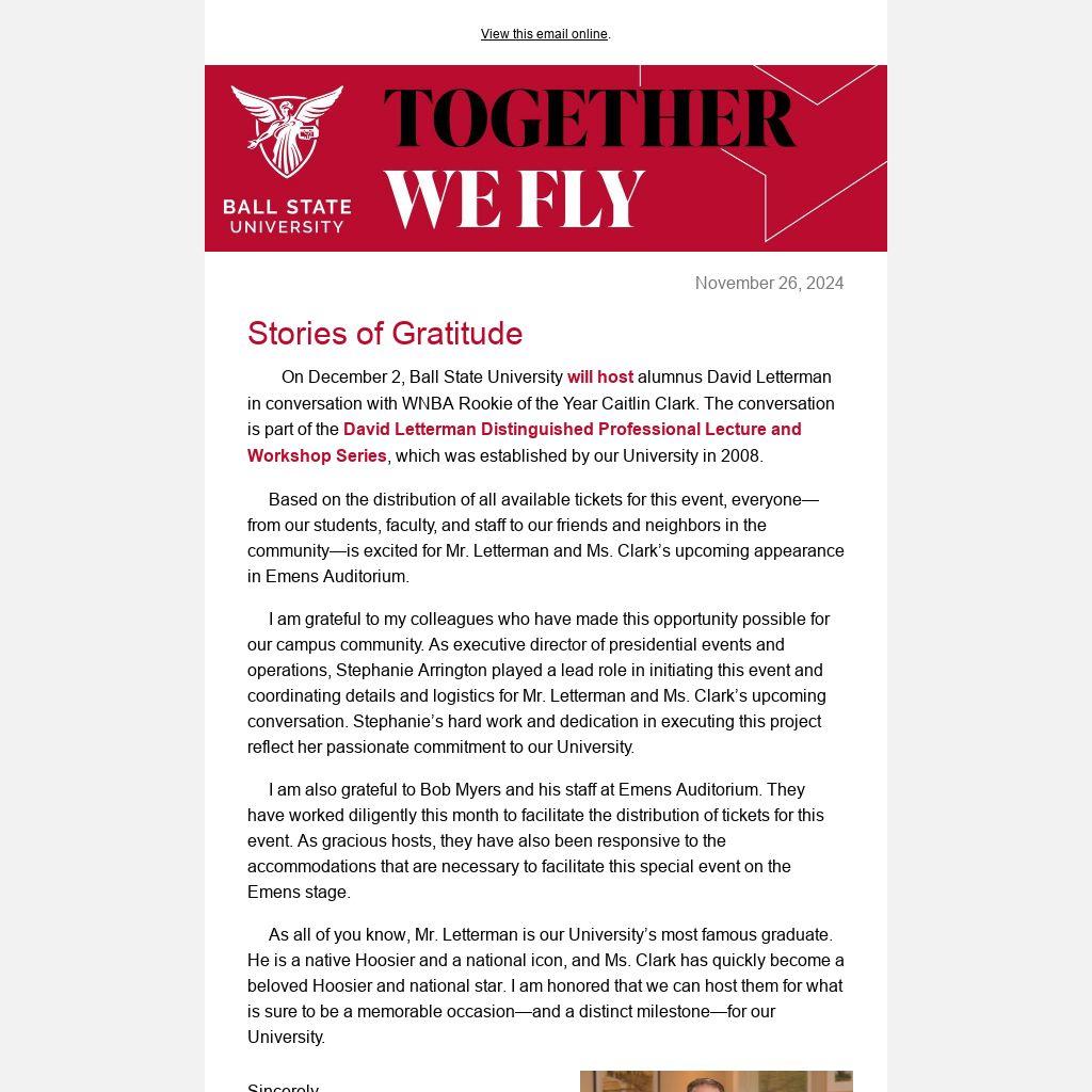 I am grateful to my colleagues who have made this opportunity possible for our campus community. As executive director of presidential events and operations, Stephanie Arrington played a lead role in initiating this event and coordinating details and logistics for Mr. Letterman and Ms. Clark’s upcoming conversation. Stephanie’s hard work and dedication in executing this project reflect her passionate commitment to our University.