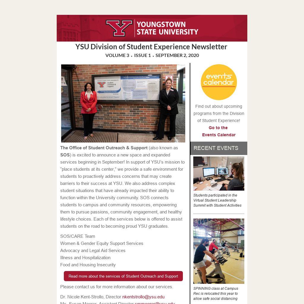 The Office of Student Outreach & Support (also known as SOS) is excited to announce a new space and expanded services beginning in September! In support of YSU’s mission to “place students at its center,” we provide a safe environment for students to proactively address concerns that may create barriers to their success at YSU. We also address complex student situations that have already impacted their ability to function within the University community. SOS connects students to campus and community resources, empowering them to pursue passions, community engagement, and healthy lifestyle choices. Each of the services below is offered to assist students on the road to becoming proud YSU graduates.