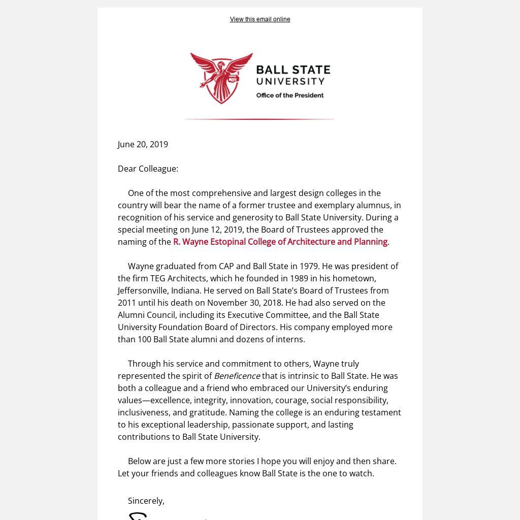 One of the most comprehensive and largest design colleges in the country will bear the name of a former trustee and exemplary alumnus, in recognition of his service and generosity to Ball State University. During a special meeting on June 12, 2019, the Board of Trustees approved the naming of the R. Wayne Estopinal College of Architecture and Planning.