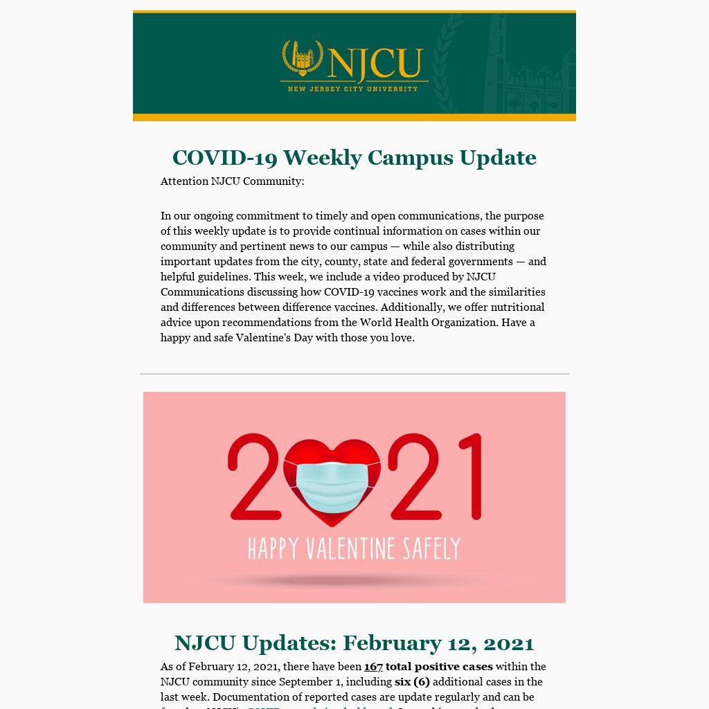 In our ongoing commitment to timely and open communications, the purpose of this weekly update is to provide continual information on cases within our community and pertinent news to our campus — while also distributing important updates from the city, county, state and federal governments — and helpful guidelines. This week, we include a video produced by NJCU Communications discussing how COVID-19 vaccines work and the similarities and differences between difference vaccines. Additionally, we offer nutritional advice upon recommendations from the World Health Organization. Have a happy and safe Valentine's Day with those you love.