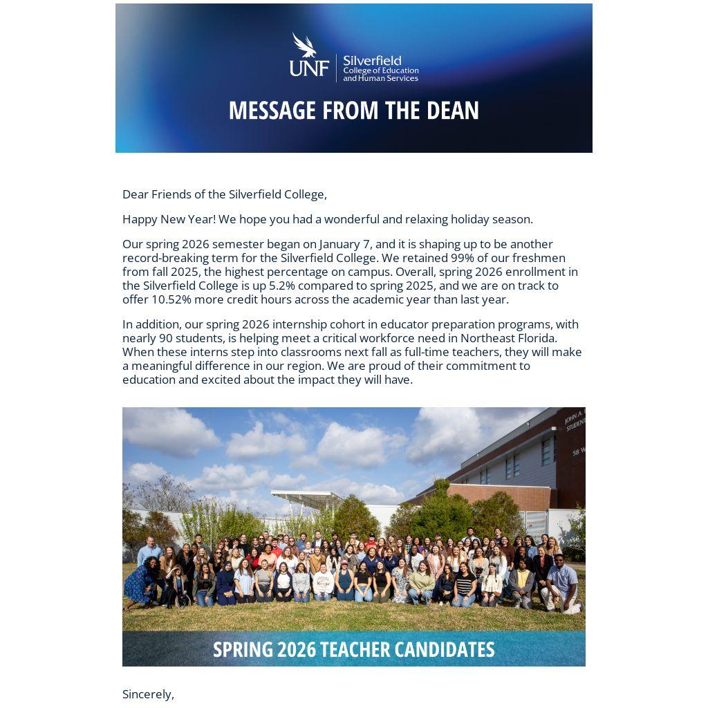 In addition, our spring 2026 internship cohort in educator preparation programs, with nearly 90 students, is helping meet a critical workforce need in Northeast Florida. When these interns step into classrooms next fall as full-time teachers, they will make a meaningful difference in our region. We are proud of their commitment to education and excited about the impact they will have.