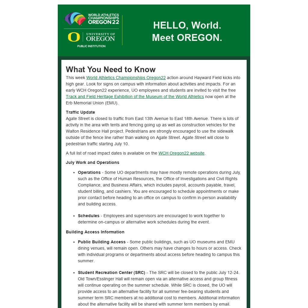 The UO's WCH Oregon22 website will continue to be updated with the latest information and FAQs about campus opportunities and impact. You may also submit a question or comment using this web form.