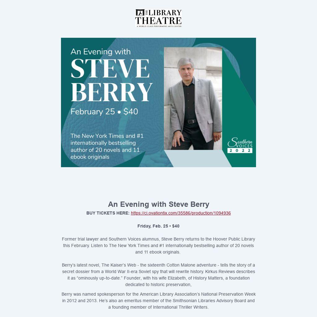 Former trial lawyer and Southern Voices alumnus, Steve Berry returns to the Hoover Public Library this February. Listen to The New York Times and #1 internationally bestselling author of 20 novels and 11 ebook originals.