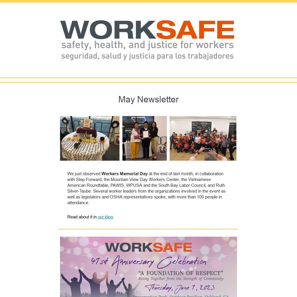 We just observed Workers Memorial Day at the end of last month, in collaboration with Step Forward, the Mountain View Day Workers Center, the Vietnamese American Roundtable, PAWIS, WPUSA and the South Bay Labor Council, and Ruth Silver-Taube. Several worker leaders from the organizations involved in the event as well as legislators and OSHA representatives spoke, with more than 100 people in attendance.