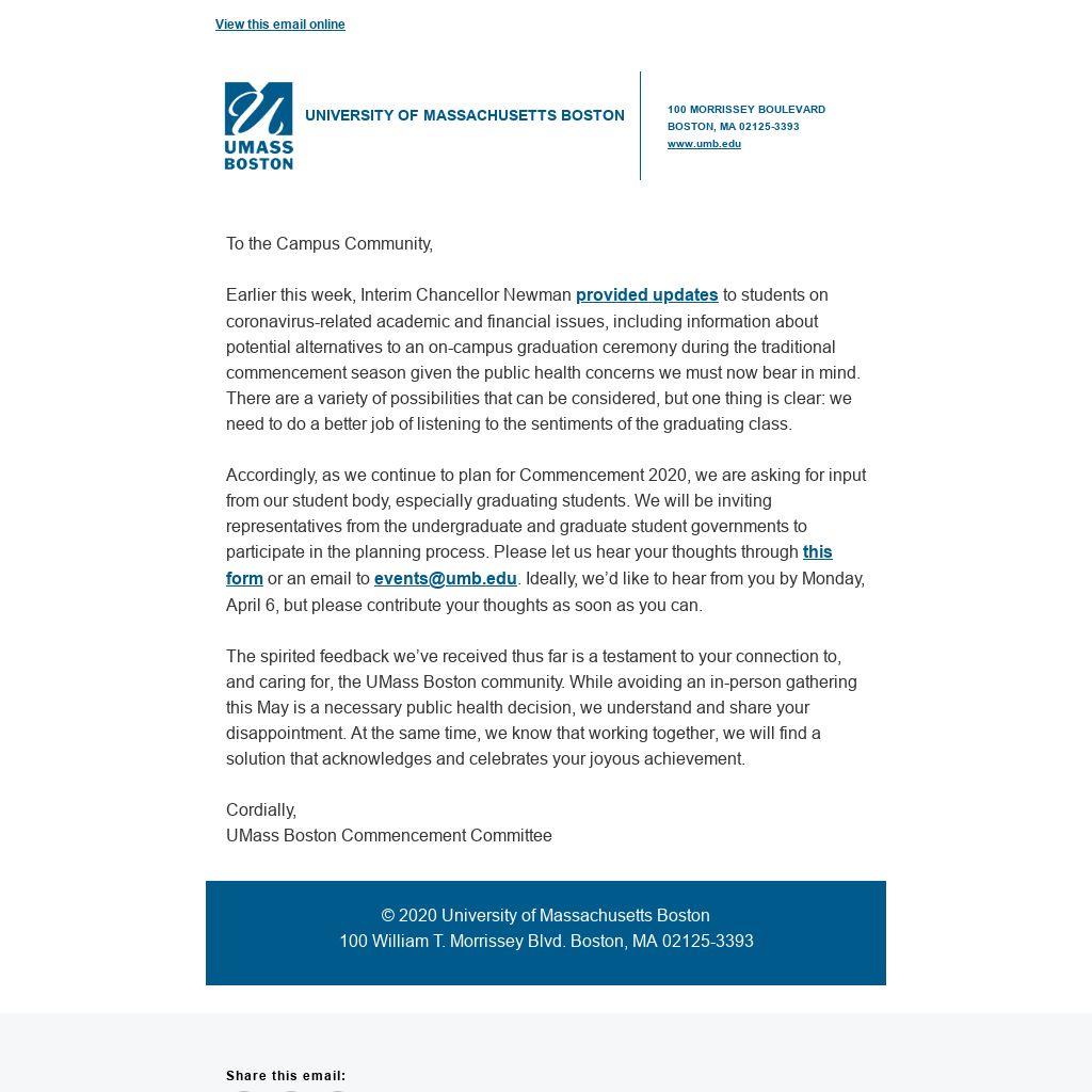 Accordingly, as we continue to plan for Commencement 2020, we are asking for input from our student body, especially graduating students. We will be inviting representatives from the undergraduate and graduate student governments to participate in the planning process. Please let us hear your thoughts through this form or an email to events@umb.edu. Ideally, we’d like to hear from you by Monday, April 6, but please contribute your thoughts as soon as you can.