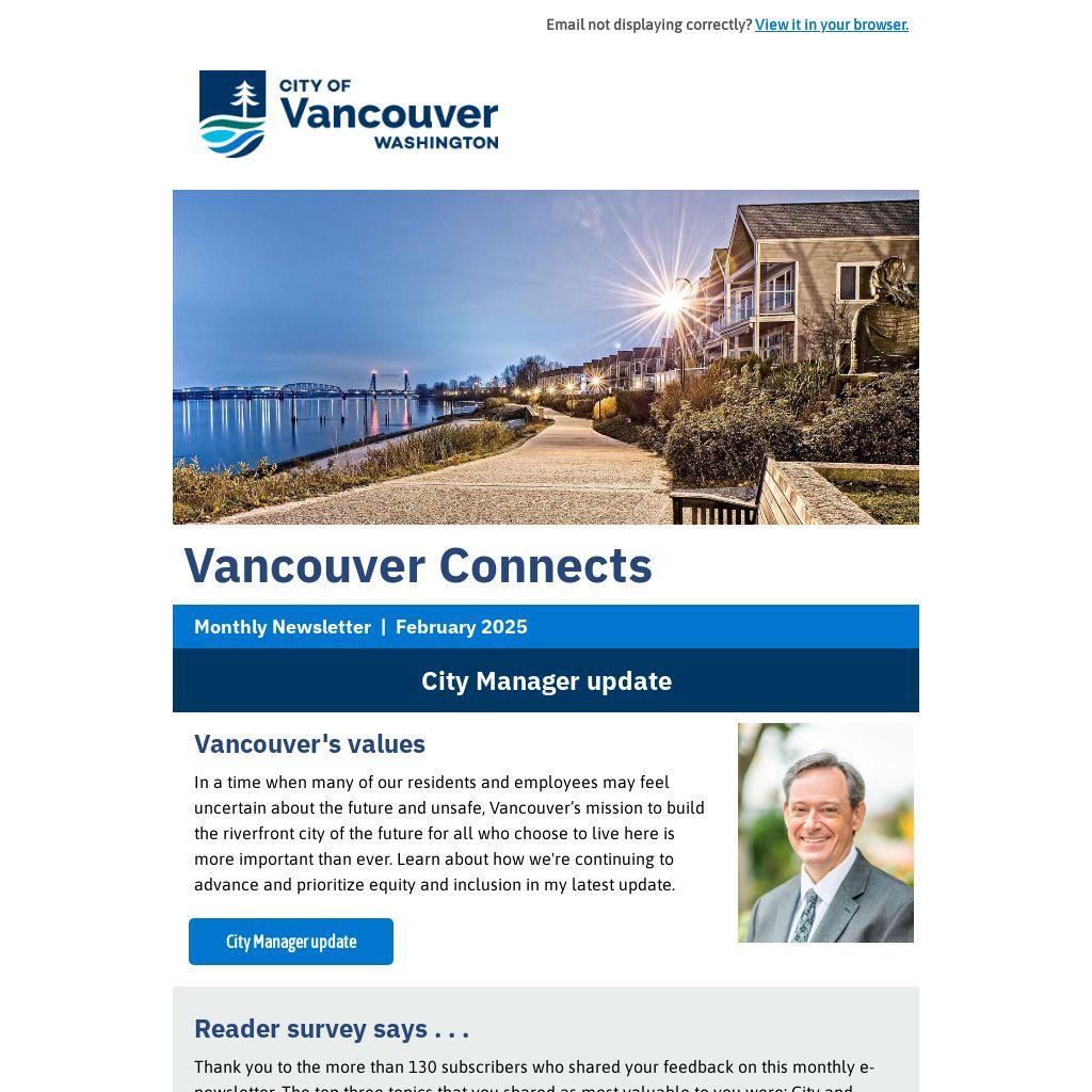 Thank you to the more than 130 subscribers who shared your feedback on this monthly e-newsletter. The top three topics that you shared as most valuable to you were: City and community special events, City Council updates and public safety news/resources. Moving forward, you'll see more of this content in your monthly update. Don't be a stranger! Please reach out to us at cityinfo@cityofvancouver.us anytime to share your feedback or ideas.