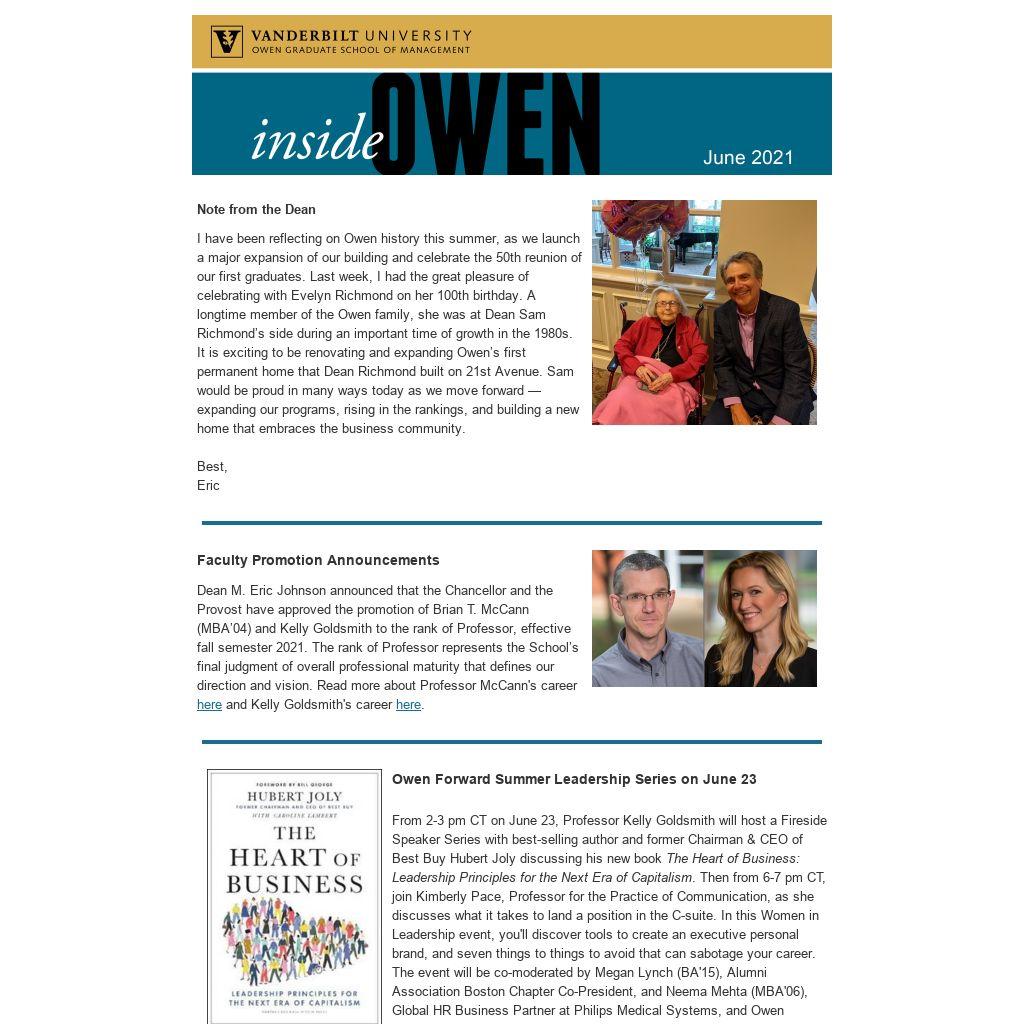 From 2-3 pm CT on June 23, Professor Kelly Goldsmith will host a Fireside Speaker Series with best-selling author and former Chairman & CEO of Best Buy Hubert Joly discussing his new book The Heart of Business: Leadership Principles for the Next Era of Capitalism. Then from 6-7 pm CT, join Kimberly Pace, Professor for the Practice of Communication, as she discusses what it takes to land a position in the C-suite. In this Women in Leadership event, you'll discover tools to create an executive personal brand, and seven things to things to avoid that can sabotage your career. The event will be co-moderated by Megan Lynch (BA'15), Alumni Association Boston Chapter Co-President, and Neema Mehta (MBA'06), Global HR Business Partner at Philips Medical Systems, and Owen Alumni Board Member. Register here.
