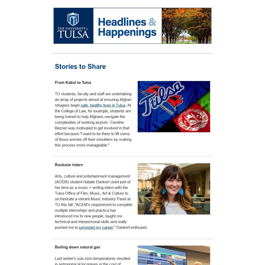 TU students, faculty and staff are undertaking an array of projects aimed at ensuring Afghan refugees begin safe, healthy lives in Tulsa. At the College of Law, for example, students are being trained to help Afghans navigate the complexities of seeking asylum. Caroline Bezner was motivated to get involved in that effort because "I want to be there to lift some of those worries off their shoulders by making this process more manageable."