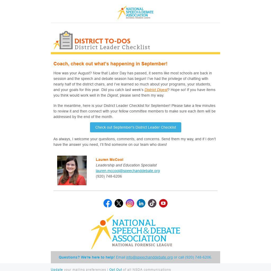 How was your August? Now that Labor Day has passed, it seems like most schools are back in session and the speech and debate season has begun! I’ve had the privilege of chatting with nearly half of the district chairs, and I’ve learned so much about your programs, your students, and your goals for this year. Did you catch last week’s District Digest? Hope so! If you have items you think would work well in the Digest, please send them my way.