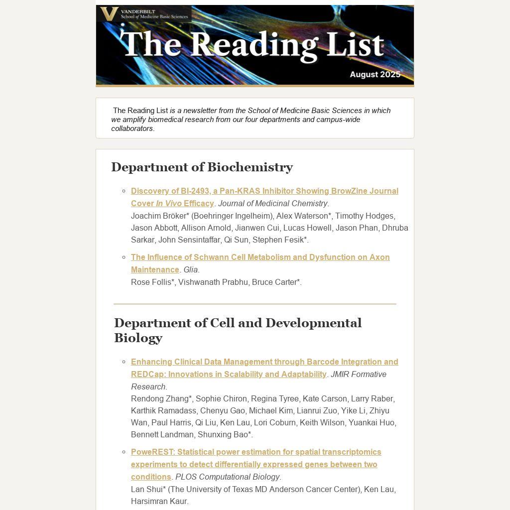 The Reading List is a newsletter from the School of Medicine Basic Sciences in which we amplify biomedical research from our four departments and campus-wide collaborators.