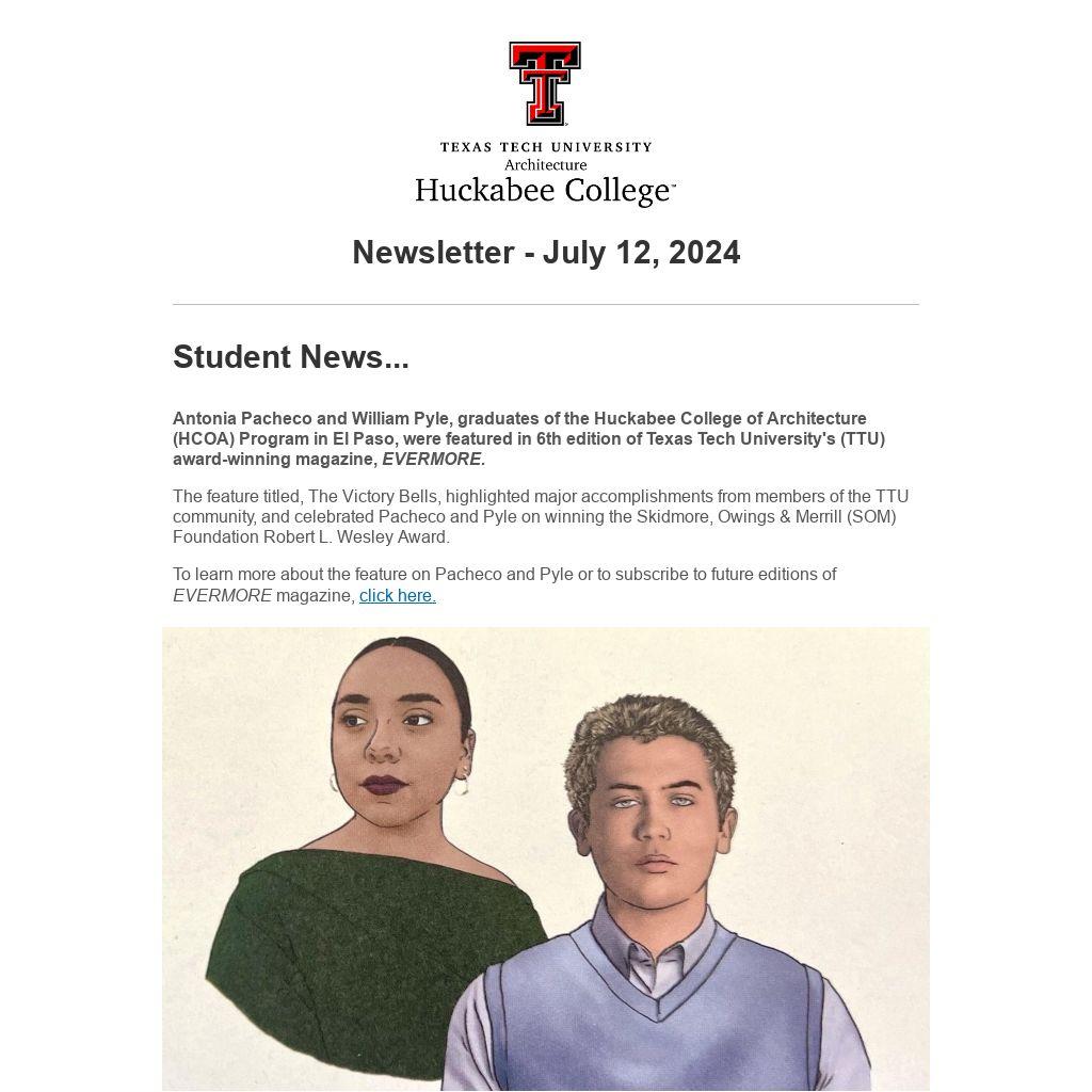 Antonia Pacheco and William Pyle, graduates of the Huckabee College of Architecture (HCOA) Program in El Paso, were featured in 6th edition of Texas Tech University's (TTU) award-winning magazine, EVERMORE.
