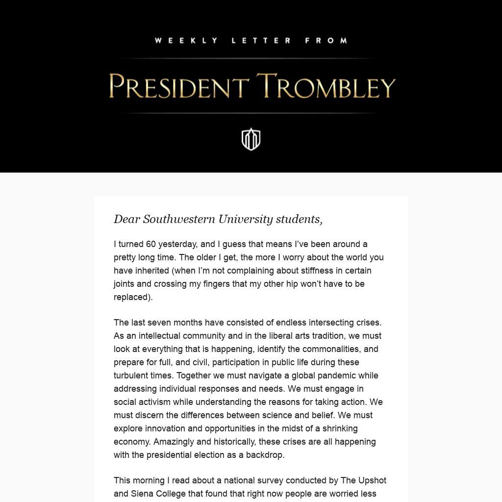 No matter the outcome of the election, there will likely be turmoil and perhaps even violence and tragedy. But not here at Southwestern. This is where we will come together, in much the same way we have come together as a community to manage our way through the threat of the coronavirus. We are here to protect one another. Tomorrow and the next few weeks, we will talk, teach, listen, and take care of each other. We are a place of learning and teaching for not just one history, but for all of our histories. That is our mission. In the darkest of times, education is the light that must keep burning. If you are anxious, angry, upset, or frightened, we are here for you. I invite you to contact me directly if I can be of assistance and encourage you to participate in our small group and individual