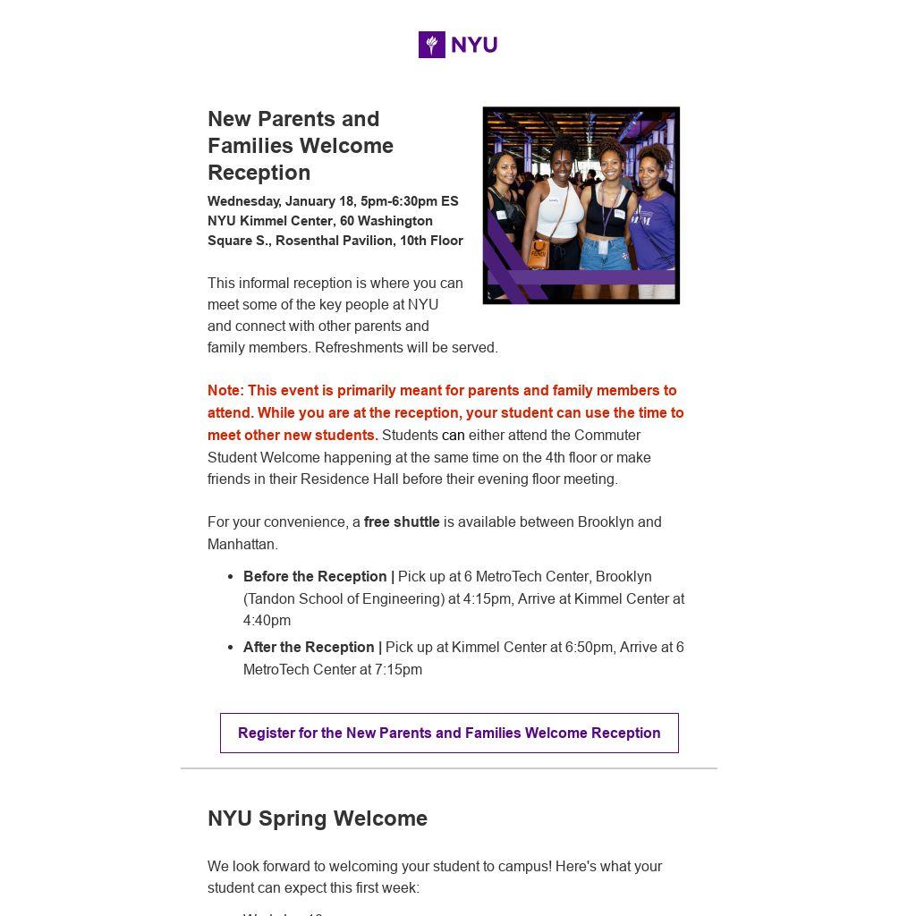 Spring Welcome events for your student include: Club Fest, Bob Ross Paint Night, Drag Karaoke, Wonderland Dreams Hand Painted Immersive Exhibit, Open Mic Night, Silent Disco, Academic Success Workshops, NYC Excursions, Group Fitness Classes, Meet the Greeks, Speed Meetings, and more! Encourage your student to find the schedule of events on their NYU Mobile app and meet new people.