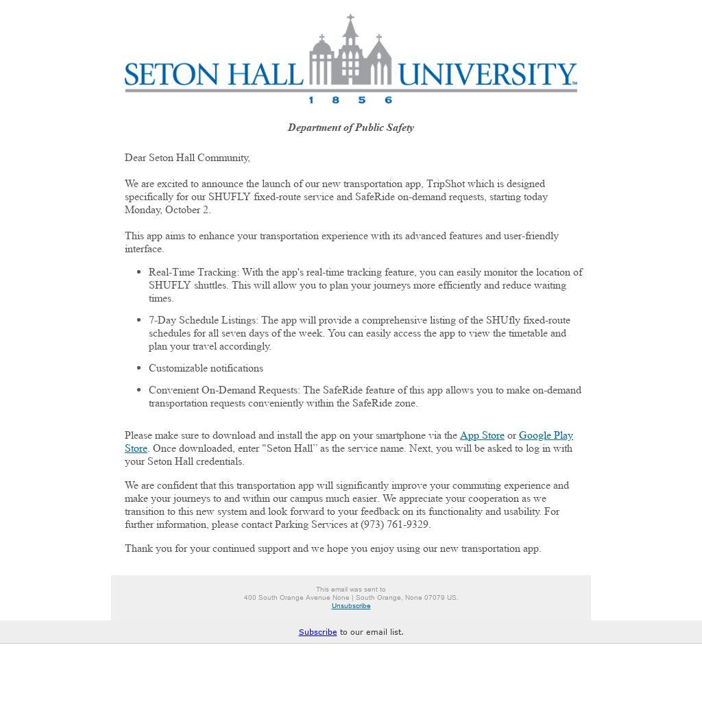 We are confident that this transportation app will significantly improve your commuting experience and make your journeys to and within our campus much easier. We appreciate your cooperation as we transition to this new system and look forward to your feedback on its functionality and usability. For further information, please contact Parking Services at (973) 761-9329.