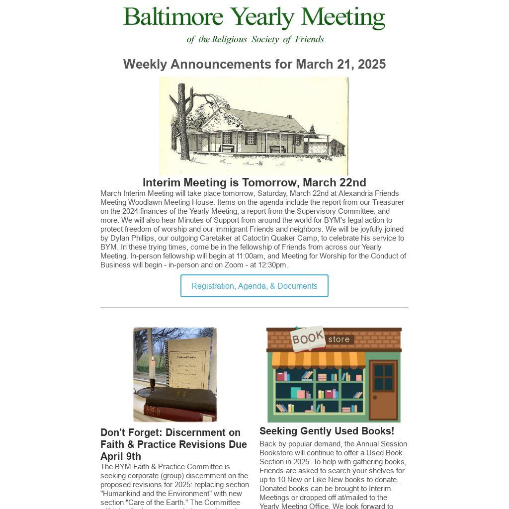 March Interim Meeting will take place tomorrow, Saturday, March 22nd at Alexandria Friends Meeting Woodlawn Meeting House. Items on the agenda include the report from our Treasurer on the 2024 finances of the Yearly Meeting, a report from the Supervisory Committee, and more. We will also hear Minutes of Support from around the world for BYM's legal action to protect freedom of worship and our immigrant Friends and neighbors. We will be joyfully joined by Dylan Phillips, our outgoing Caretaker at Catoctin Quaker Camp, to celebrate his service to BYM. In these trying times, come be in the fellowship of Friends from across our Yearly Meeting. In-person fellowship will begin at 11:00am, and Meeting for Worship for the Conduct of Business will begin - in-person and on Zoom - at 12:30pm.
