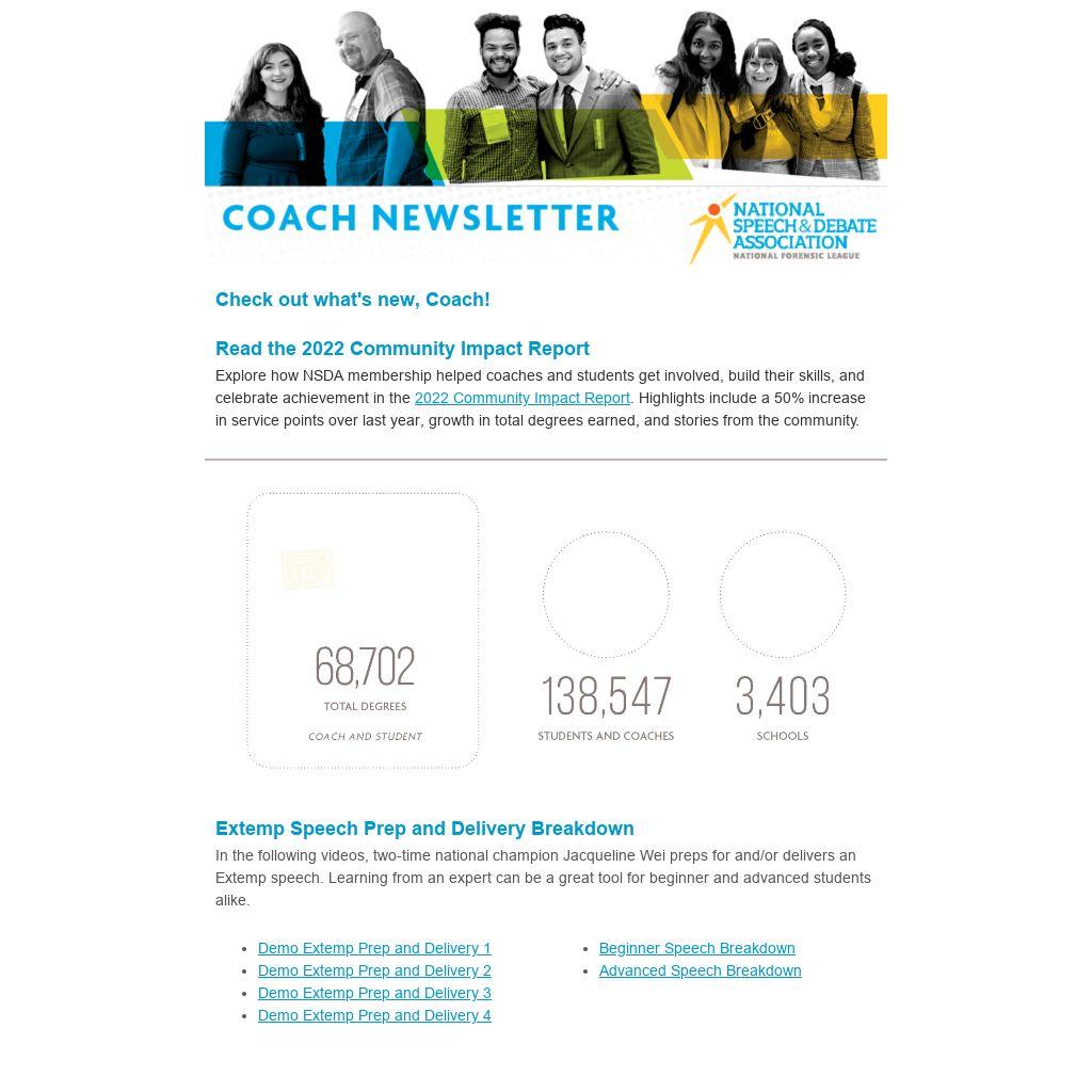 Explore how NSDA membership helped coaches and students get involved, build their skills, and celebrate achievement in the 2022 Community Impact Report. Highlights include a 50% increase in service points over last year, growth in total degrees earned, and stories from the community.