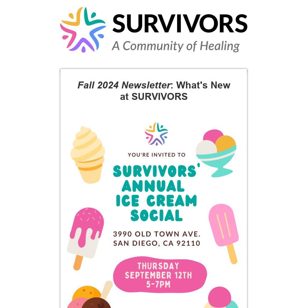 Don't miss SURVIVORS' Annual Ice Cream Social, a fun and uplifting community event taking place on Thursday, September 12th from 5:00 PM to 7:00 PM at our Healing Center in Old Town. Connect with our team, community partners, clients, supporters, medical providers, and more. Over delicious ice cream provided by Ben & Jerry's of Seaport Village, we’ll celebrate our shared commitment to healing and support for those in need.