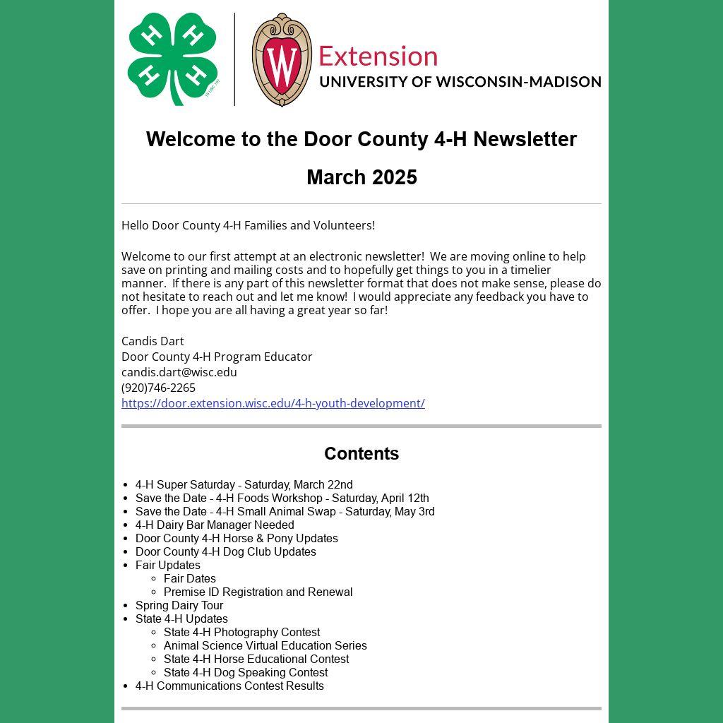 The 21st Annual Door County 4-H Small Animal Swap will be held on Saturday, May 3, 2025, at the Door County Fairgrounds in Sturgeon Bay. Additional information will be available about this event soon but be sure to save the date to join us!
