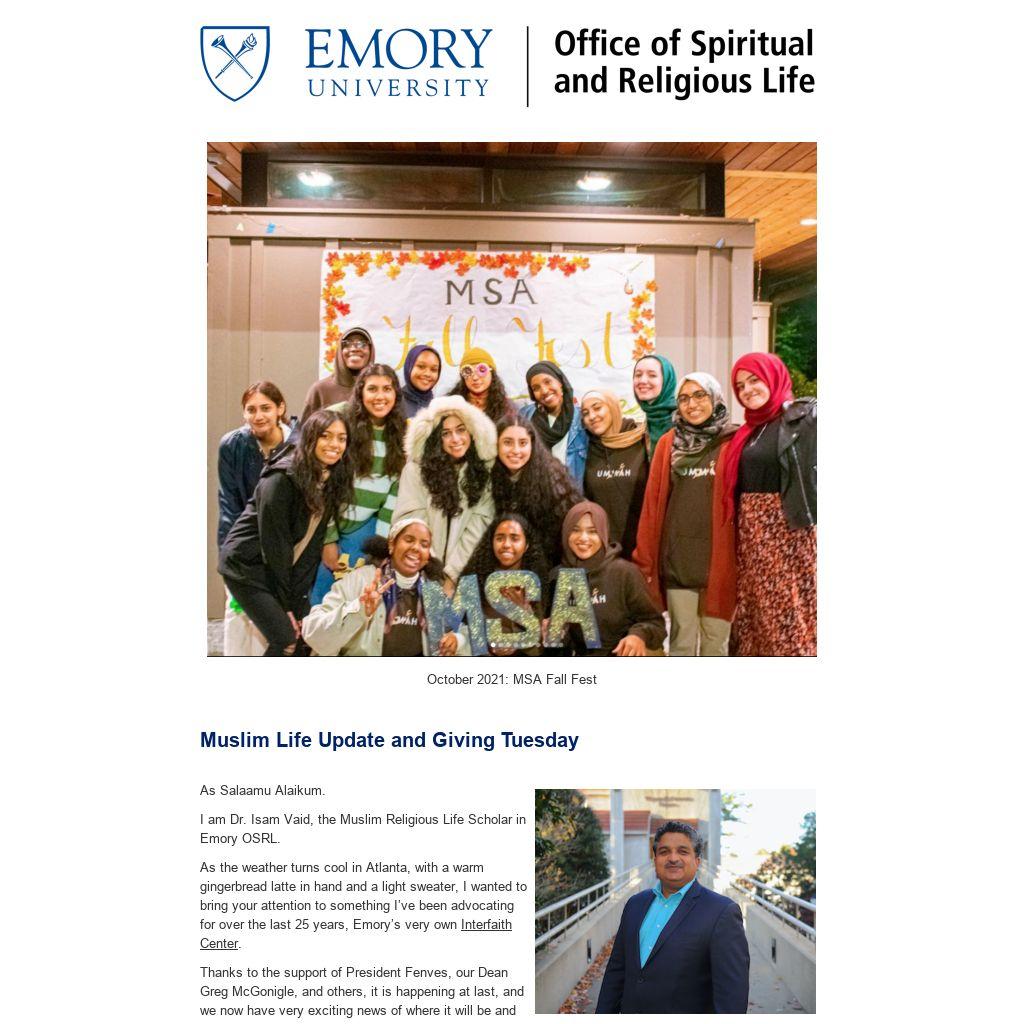 Now as the semester comes to a close, Emory Giving Tuesday is coming up on November 30, right after Thanksgiving. We would be greatful if you would think about the new Emory Interfaith Center on #givingtuesday; your contributions to help us maximize our program in the new space are welcome