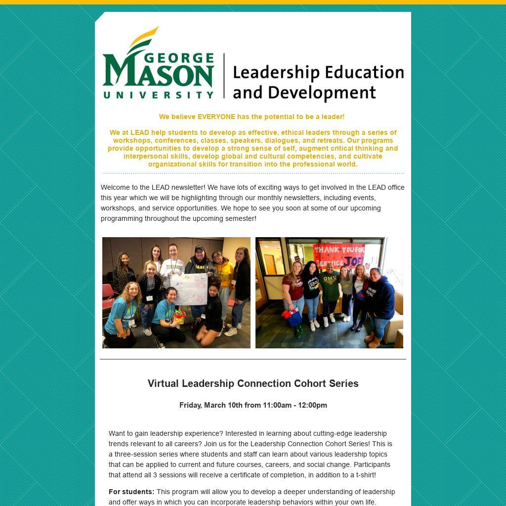 The LEAD Graduate Professional Assistant (GA) will be an integral part of the LEAD team, helping to provide leadership training, resources, services, and recognition to empower all Mason students to become more effective, ethical leaders.
