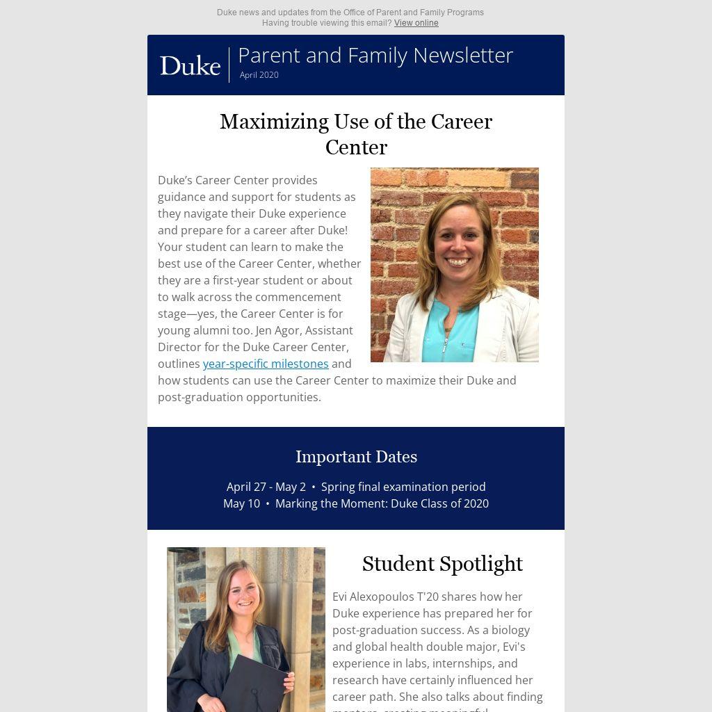 Duke’s Career Center provides guidance and support for students as they navigate their Duke experience and prepare for a career after Duke! Your student can learn to make the best use of the Career Center, whether they are a first-year student or about to walk across the commencement stage—yes, the Career Center is for young alumni too. Jen Agor, Assistant Director for the Duke Career Center, outlines year-specific milestones and how students can use the Career Center to maximize their Duke and post-graduation opportunities.