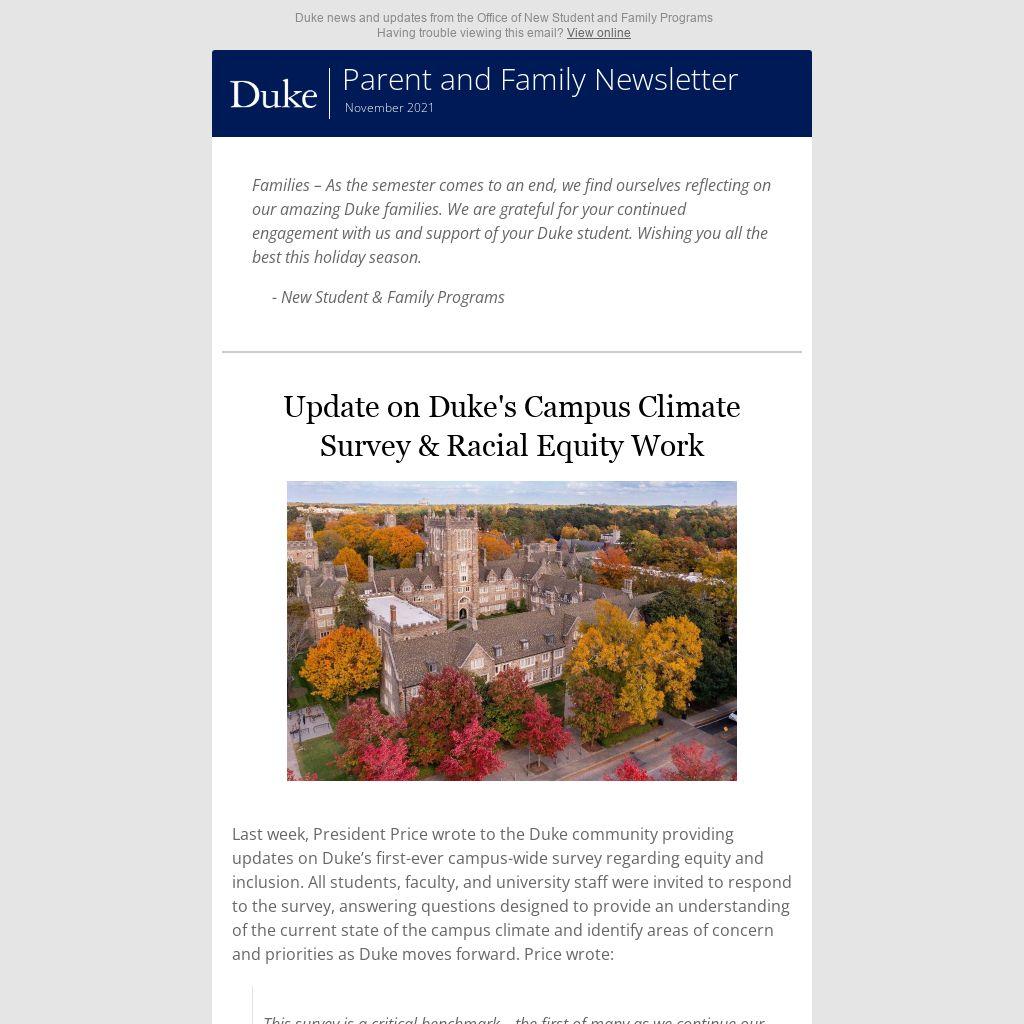 Families – As the semester comes to an end, we find ourselves reflecting on our amazing Duke families. We are grateful for your continued engagement with us and support of your Duke student. Wishing you all the best this holiday season.