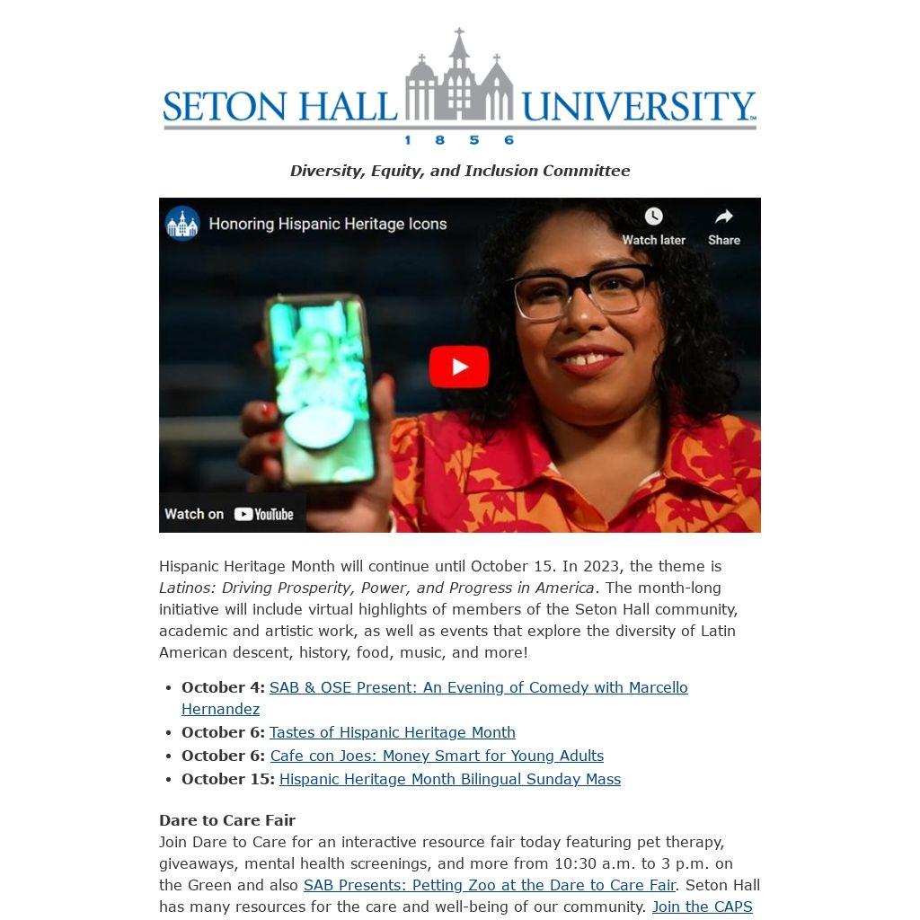 Hispanic Heritage Month will continue until October 15. In 2023, the theme is Latinos: Driving Prosperity, Power, and Progress in America. The month-long initiative will include virtual highlights of members of the Seton Hall community, academic and artistic work, as well as events that explore the diversity of Latin American descent, history, food, music, and more!