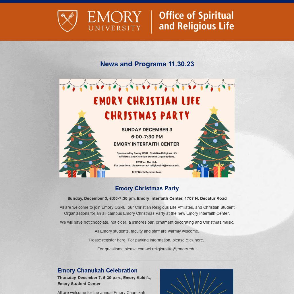 Emory OSRL ENews is published weekly during term by the Emory University Office of Spiritual and Religious Life publicizing Atlanta-campus spiritual life programs. It is not a comprehensive listing. For Oxford College spiritual life, please click here. To submit information or to update your preferences, please contact religiouslife@emory.edu.