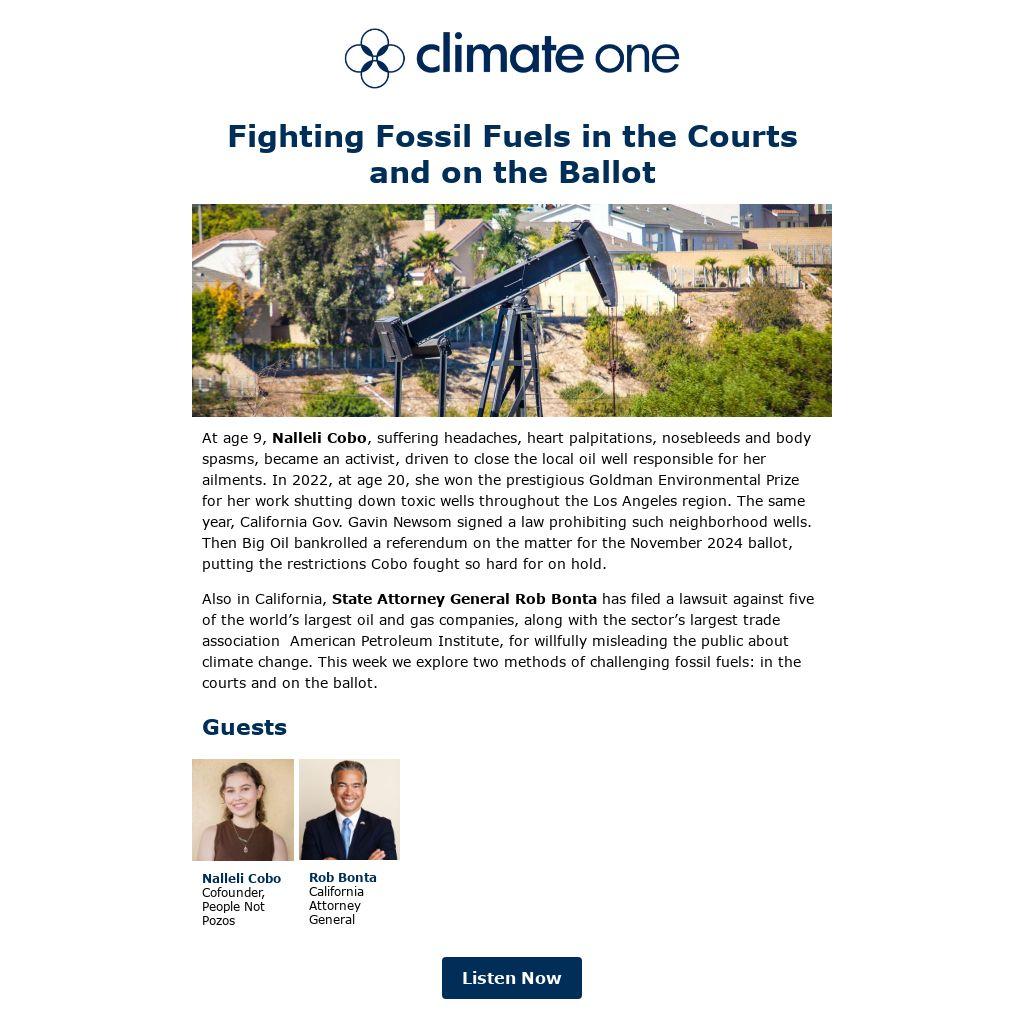 Also in California, State Attorney General Rob Bonta has filed a lawsuit against five of the world’s largest oil and gas companies, along with the sector’s largest trade association American Petroleum Institute, for willfully misleading the public about climate change. This week we explore two methods of challenging fossil fuels: in the courts and on the ballot.