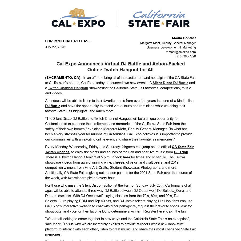 (SACRAMENTO, CA) - In an effort to bring all of the excitement and nostalgia of the CA State Fair to Californian’s homes, Cal Expo today announced two new events: A Silent Disco DJ Battle and a Twitch Channel Hangout showcasing the California State Fair favorites, competitions, music and videos.