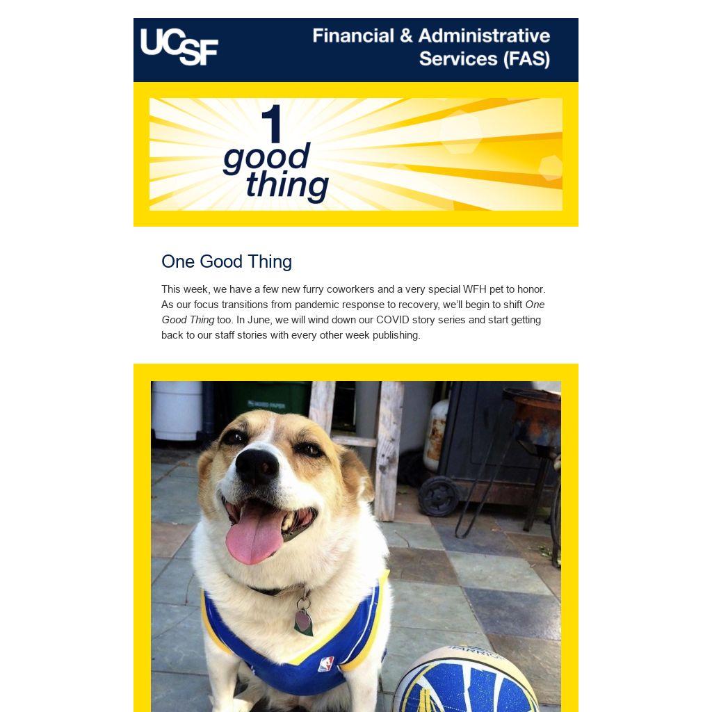 This week, we have a few new furry coworkers and a very special WFH pet to honor. As our focus transitions from pandemic response to recovery, we’ll begin to shift One Good Thing too. In June, we will wind down our COVID story series and start getting back to our staff stories with every other week publishing.