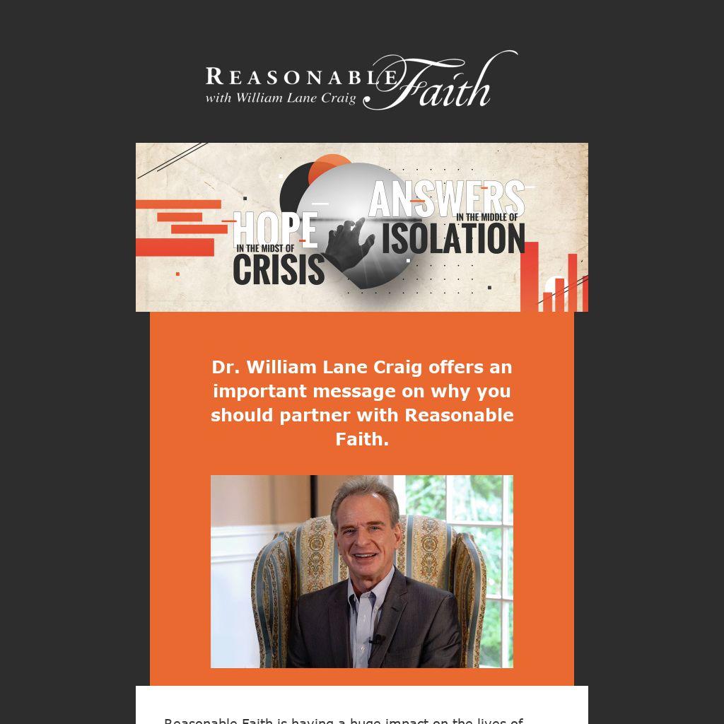 Thank you for your interest in this incredible ministry led by Dr. William Lane Craig. It is through your partnership with Reasonable Faith that we are able to reach out to students on college campuses as well as provide popular level content online to help answer their questions and doubts. Through internet resources such as our animated videos, we offer clear, compelling evidence of the truth of Christianity. Even now we are working hard to translate many of our online materials into some of the world’s most commonly spoken languages so that even more people can find hope in the Gospel message.