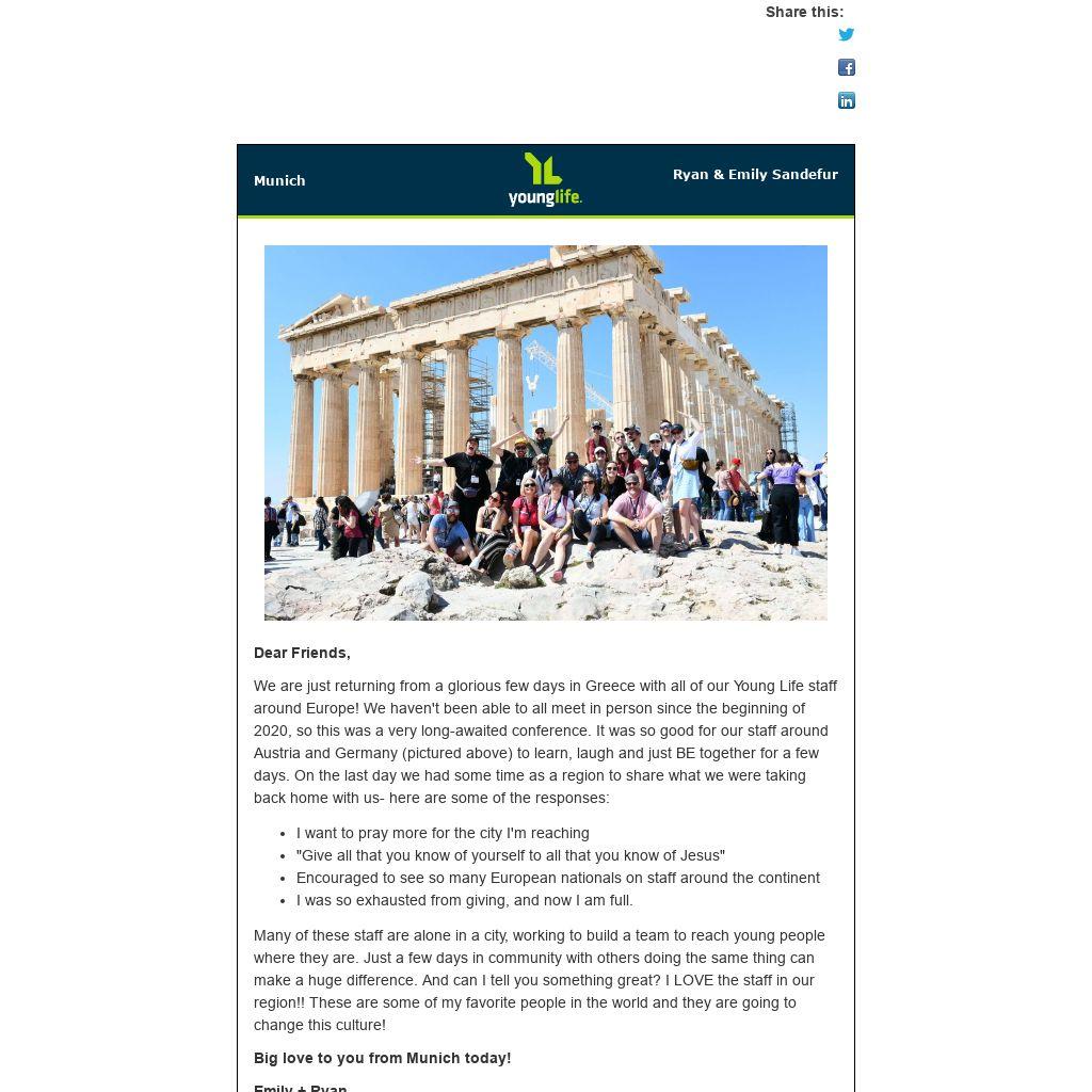 We are just returning from a glorious few days in Greece with all of our Young Life staff around Europe! We haven't been able to all meet in person since the beginning of 2020, so this was a very long-awaited conference. It was so good for our staff around Austria and Germany (pictured above) to learn, laugh and just BE together for a few days. On the last day we had some time as a region to share what we were taking back home with us- here are some of the responses: