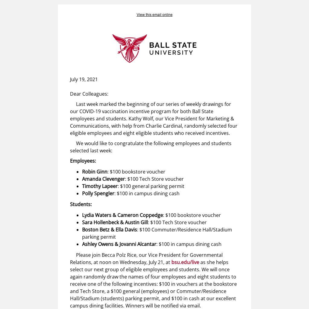 Please join Becca Polz Rice, our Vice President for Governmental Relations, at noon on Wednesday, July 21, at bsu.edu/live as she helps select our next group of eligible employees and students. We will once again randomly draw the names of four employees and eight students to receive one of the following incentives: $100 in vouchers at the bookstore and Tech Store, a $100 general (employees) or Commuter/Residence Hall/Stadium (students) parking permit, and $100 in cash at our excellent campus dining facilities. Winners will be notified via email.