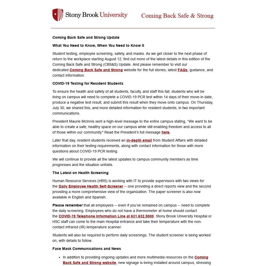 - The Coming Back Safe and Strong planning team has taken the extra initiative to help keep the members of our community safe by designing and purchasing 100,000 “Stony Brook Strong” cloth face masks. They should be on campus the week of August 10. Two of each will be made available to all students, faculty, and staff – distributed by campus residences and building managers. Watch for an update soon.